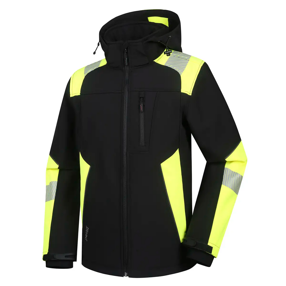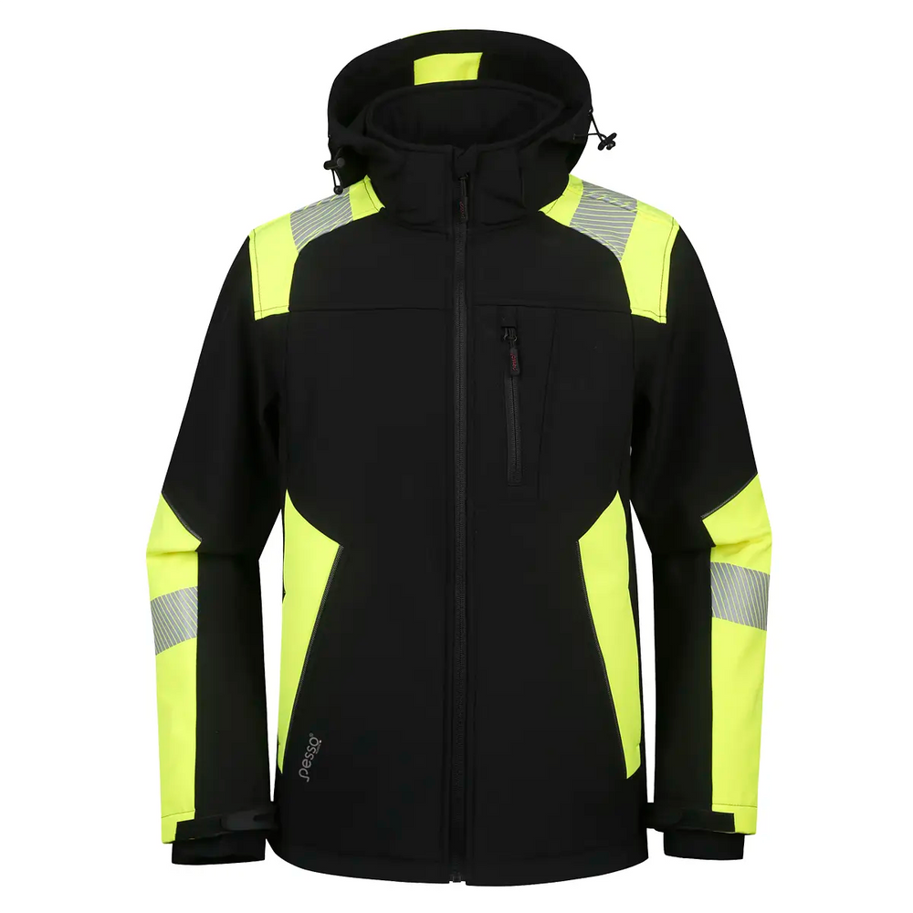 Water-repellent softshell jacket from Pesso Nordic in stretch material. With high-visibility yellow details and a thicker comfortable collar, it is suitable for work that requires mobility, visibility and comfort. The jacket has a removable hood, adjustable Velcro straps at the wrists and adjustable cords around the entire jacket for the best fit.